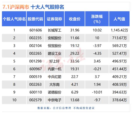 7月1日,沪深两市双双收涨,成交量略有萎缩。板块方面化学制药、贵金属涨幅居前,互联网金融、云计算板块跌幅居前。人气股方面长城军工(601606)、安妮股份(002235)收于涨停,诺德股份(600110)、建设工业(002265)跌幅居前。下面是今日十大人气股排名的详细情况。